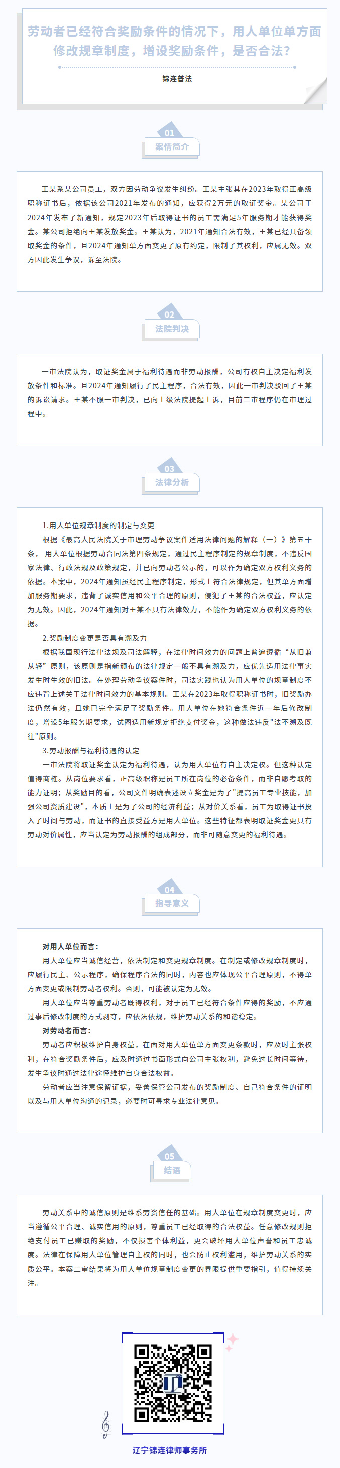 锦连普法||劳动者已经符合奖励条件的情况下,用人单位单方面修改规章制度,增设奖励条件,是否合法?